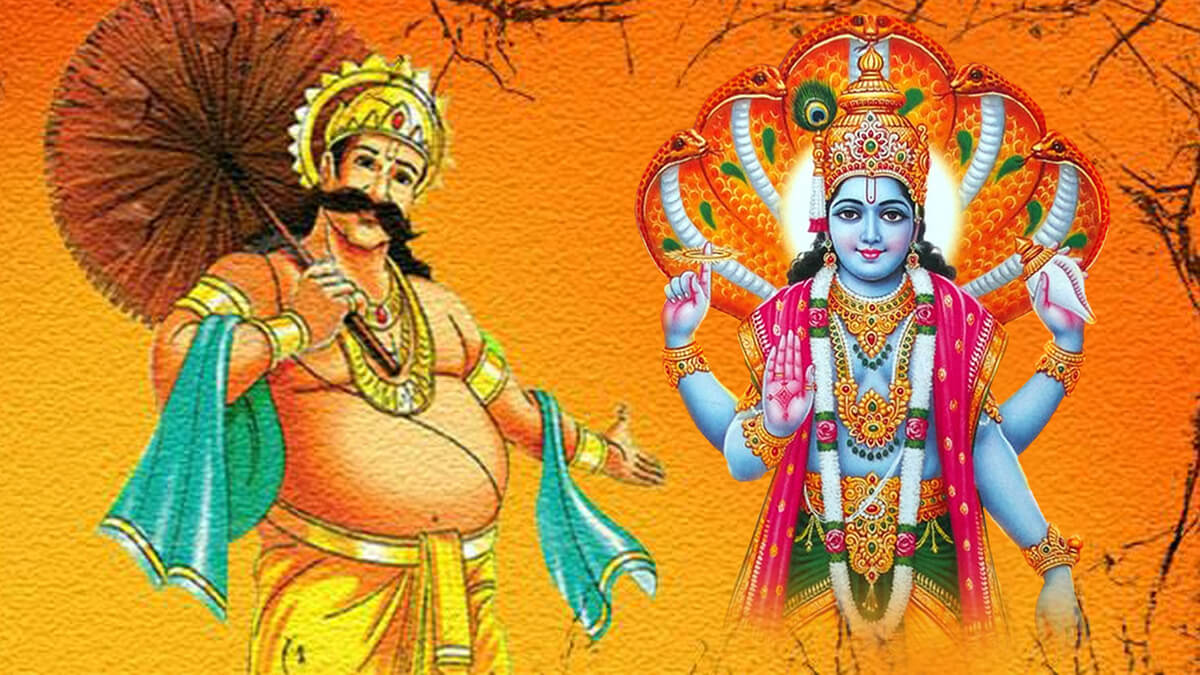 മഹാവിഷ്ണു ഭക്തനായിരുന്ന, നരസിംഹാവതാരത്തിന് കാരണക്കാരനായ അസുര രാജാവ് പ്രഹ്ളാദന്റെ പൗത്രനാണ് മഹാബലി. സത്യധർമ്മാദികൾ പരിപാലിച്ചു പോന്ന മഹാബലി ഭൂമിയും സ്വർഗ്ഗവും കീഴടക്കി മൂന്നു ലോകത്തിന്റെയും അധിപനായി. ബലിയുടെ ഭരണകാലം ഭൂമിയിലെ ഏറ്റവും നല്ല കാലമായി; പരസ്പരം സ്നേഹിച്ചും വിശ്വസിച്ചും അദ്ധ്വാനിച്ചും മനുഷ്യർ ജീവിച്ചു. അസുരരാജാവായ മഹാബലി പാതാളമാണ് ഭരിക്കേണ്ടത്. അദ്ദേഹം സ്വർഗ്ഗവും ഭൂമിയും ആക്രമിച്ച് കീഴടക്കിയത് ധർമ്മ ലംഘനമാണെന്ന പരാതിയുമായി ഇന്ദ്രനും കൂട്ടരും മഹാവിഷ്ണുവിനെ സമീപിച്ചു. ബലിയെ ഉത്ബോധിപ്പിക്കേണ്ടത് കടമയാണെന്ന് വിഷ്ണുവിന് തോന്നി. ഇതിനുമുൻപേ ദൈത്യർ ദേവന്മരെ ദ്രോഹിക്കുന്ന കാര്യം ദേവമാതാവ് അദിതി ഭർത്താവിനോട് പരാതിപ്പെട്ടു. കശ്യപന്റെ നിർദ്ദേശം സ്വീകരിച്ച് അദിതി മഹാവിഷ്ണുവിനെ പ്രീതിപ്പെടുത്താൻ പയോവ്രതം നോറ്റു. വ്രതാവസാനം മഹാവിഷ്ണു പ്രത്യക്ഷപ്പെട്ട് അദിതിയുടെ ഗർഭത്തിൽ കടന്ന് പുത്രനായി ജനിച്ച് ദേവകളെ രക്ഷിക്കാം എന്ന് വരം നൽകി. അദിതി ഗർഭിണിയായി, ഭാദ്രപദത്തിൽ തിരുവോണം നക്ഷത്രം ദിവസം വാമനൻ അവതരിച്ചു. ജനന നേരം ചതുർബാഹു ആയിരുന്ന ശിശു മാതാപിതാക്കൾ നോക്കിനിൽക്കേ രൂപാന്തരം പ്രാപിച്ച് ശിശുവായ വാമനനായി. ദേവകൾ ശിശുവിന് ഉപഹാരങ്ങൾ നൽകി ശക്തനാക്കി. സൂര്യൻ സാവിത്രിമന്ത്രം ഉപദേശിച്ചു. ബൃഹസ്പതി ഉപവീതമേകി. കശ്യപൻ അരഞ്ഞാണവും ആകാശം ഛത്രത്തെയും ഭൂമി കൃഷ്ണാജിനത്തെയും വനസ്പതിയായ സോമൻ ദണ്ഡത്തെയും അദിതി കൗപീനത്തെയും സപ്തർഷികൾ കുശപ്പുല്ലിനെയും ബ്രഹ്മാവ് കമണ്ഡലവും സരസ്വതി അക്ഷമാലയും കുബേരൻ പാത്രികയെയും സമ്മാനിച്ചു. മഹാബലി അപ്പോൾ ഒരു അശ്വമേധം നടത്തി അതിന്റെ പരിസമാപ്തിയുടെ ഭാഗമായി ഒരു മഹായാഗത്തിന് ഒരുങ്ങുകയായിരുന്നു. അപ്പോഴാണ് ഛത്രം, ദണ്ഡം, കമണ്ഡലു എന്നിവ ധരിച്ച് തേജോരൂപിയായ വാമനൻ കടന്നു വന്നത്. വാമനനെ സ്വാഗതം ചെയ്ത് വണങ്ങിയ ബലി എന്ത് ദാനമാണ് വേണ്ടതെന്ന് ചോദിച്ചു. തനിക്ക് മൂന്ന് ചുവട് വയ്ക്കാൻ സ്ഥലം ദാനം വേണമെന്ന് വാമനൻ പറഞ്ഞു. അസുരഗുരു ശുക്രാചാര്യൻ അപകടം മണത്തു. പാടില്ല എന്ന ഉപദേശം മാനിക്കാതെ മഹാബലി ദാനത്തിന് സമ്മതിച്ചു.