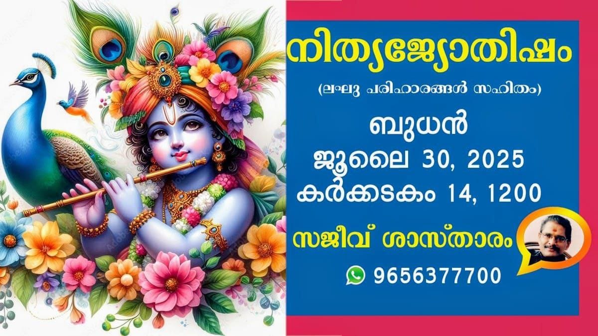 ദിവസത്തിന് ചേർന്ന ലാൽ – കിതാബ് നിർദ്ദേശം: ചെറുപയർ ഭക്ഷണത്തിൽ ഉൾപ്പെടുത്തുക , ഭവനത്തിൽ /ഓഫീസിൽ ഒരു തണ്ട് മയിൽപ്പീലി സൂക്ഷിക്കുക.