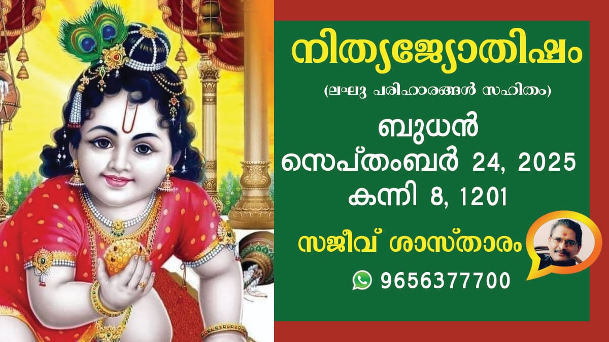 ഇന്ന് ബുധനാഴ്ച. ജനനസമയത്ത് ബുധന് നീചം, മൗഢ്യം, ദുർബ്ബല ക്ഷേത്രസ്ഥിതി എന്നിവയുള്ളവർ, വിദ്യാർഥികൾക്ക് അലസത മാറൽ തുടങ്ങിയവയ്ക്ക് ജപിക്കുവാൻ ബുധന്റെ പീഡാഹാര സ്തോത്രം ചേർക്കുന്നു. ഉദിച്ച് ഒരു മണിക്കൂറിനുള്ളിൽ