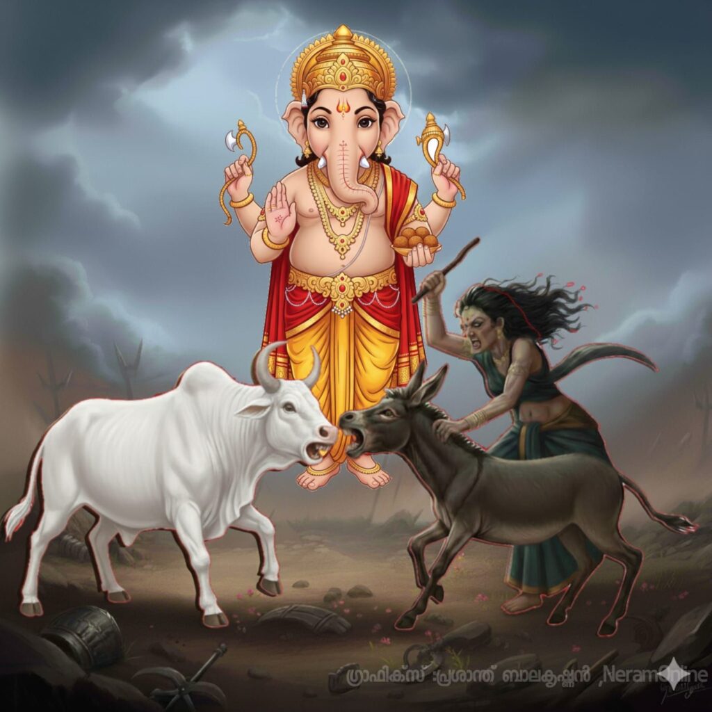 കാളയുടെയും കഴുതയുടെയും പോര് ശമിപ്പിക്കാൻ ചണ്ഡാലി ഒരു വടിയുമെടുത്ത് ഗണേശ വിഗ്രഹത്തിൻ്റെ സമീപത്തെത്തി. അവൾ കഴുതയേയും കാളയേയും