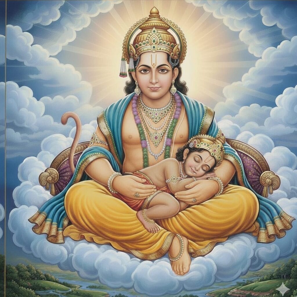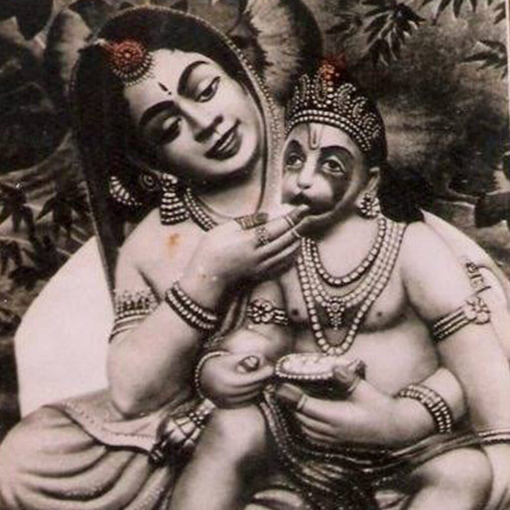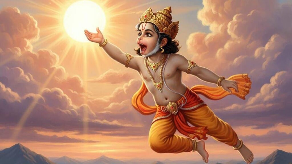 ഒരു പുത്രനുവേണ്ടി അഞ്ജന വായുദേവനെ പ്രീതിപ്പെടുത്താൻ തപസ്സ് ചെയ്യുന്ന കാലമായിരുന്നു അത്. ഭക്തയിൽ കൃപാകടാക്ഷം ചൊരിഞ്ഞ വായുദേവൻ ആ ശിശുവിനെ അഞ്ജനയ്ക്കും കേസരിക്കും കൂടി സമ്മാനിച്ചു. ആ കുഞ്ഞാണ് ആഞ്ജനേയൻ. കുഞ്ഞ് മെല്ലെ വളർന്നു. ഒരു ദിവസം കുഞ്ഞിന് നൽകാൻ പഴങ്ങൾ തേടി അഞ്ജന വനത്തിലെത്തി. ഈ സമയം കുഞ്ഞ് വിശന്ന് നിലവിളിച്ചു. അവൻ കണ്ണു തുറന്നപ്പോൾ ഉദിച്ചുയരുന്ന സൂര്യനെ കണ്ട് പഴുത്ത പഴമാണെന്ന് കരുതി മുകളിലേക്ക് ചാടി. ഉയർന്ന് പൊങ്ങിയ അവൻ സൂര്യനെ പിടിക്കാൻ ശ്രമിക്കുന്നത് കണ്ട് ഏവരും അത്ഭുതപ്പെട്ടു. കരുത്തനായ ഈ കുട്ടി ചർച്ചാ വിഷയമായി. ഗരുഡനും കാറ്റിനും മനസിനും പോലും ഇത്ര ഉയരാൻ കഴിയില്ല. ഇവൻ വലുതായാൽ എന്തായിരിക്കും അവസ്ഥ! അവർ അത്ഭുതപ്പെട്ടു.