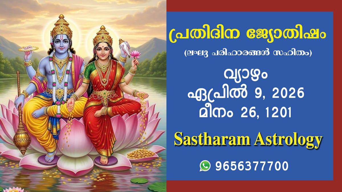 കാലത്ത് 06.36 വരെ മീനം പകൽ 08.26 വരെ മേടം പകൽ 10.30 വരെ എടവം വൈകിട്ട് 12.41 വരെ മിഥുനം പകൽ 02.48 വരെ കർക്കടകം വൈകിട്ട് 04.48 വരെ ചിങ്ങം തുടർന്ന് കന്നി