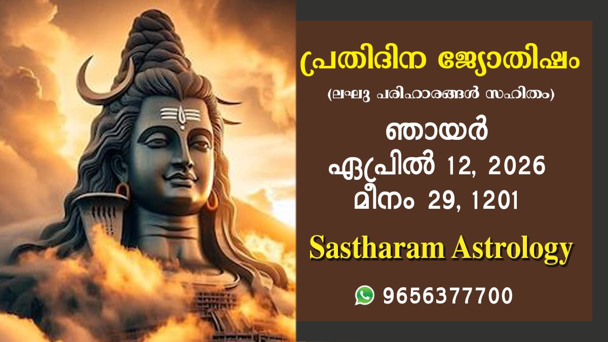 ഇന്ന് ഞായറാഴ്ച. ജനനസമയത്ത് സൂര്യന് നീചം, മൗഢ്യം, ദുർബ്ബല ക്ഷേത്ര സ്ഥിതി എന്നിവയുള്ളവർ, സൂര്യന്റെ ദശാപഹാര ഛിദ്രങ്ങളിൽ കഴിയുന്നവർ, പിതൃ ദോഷമുള്ളവർ, അഹിതമായ ഭക്ഷണ രീതി അവലംബിച്ചവർ, മൃഗഹത്യാ പാപമുള്ളവർ, മദ്യപാനത്താൽ വിഷമിക്കുന്നവർ മേടം, തുലാം ഇവ ജനനലഗ്നമോ