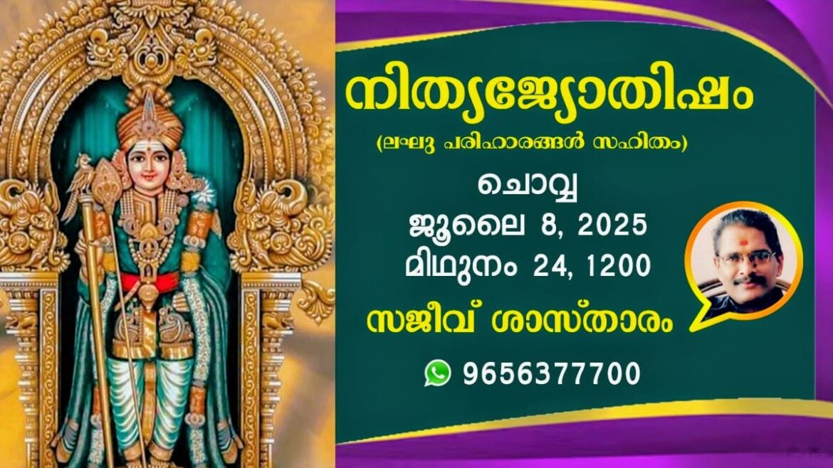 ( നേരം ഓൺ ലൈൻ ഇപ്പോള് വാട്സ്ആപ്പിലും ലഭ്യമാണ്. ഏറ്റവും പുതിയ വിശേഷങ്ങൾക്കായി ക്ലിക്ക് ചെയ്യൂ : riyoceline.com/projects/Neram/ . നേരം ഓൺലൈനിൻ പ്രസിദ്ധീകരിക്കാൻ ലേഖനങ്ങൾ, ചിത്രങ്ങൾ, വീഡിയോകൾ അയയ്ക്കേണ്ട വാട്സ്ആപ്പ് നമ്പർ : + 91 81380 15500 ) 2025 ജൂലൈ 08, ചൊവ്വകലിദിനം 1872399കൊല്ലവർഷം 1200 മിഥുനം 24(കൊല്ലവർഷം ൧൨൦൦ മിഥുനം ൨൪ )തമിഴ് വർഷം വിശ്വവസു ആനി 24ശകവർഷം 1947 ആഷാഢം 17 ഉദയം …