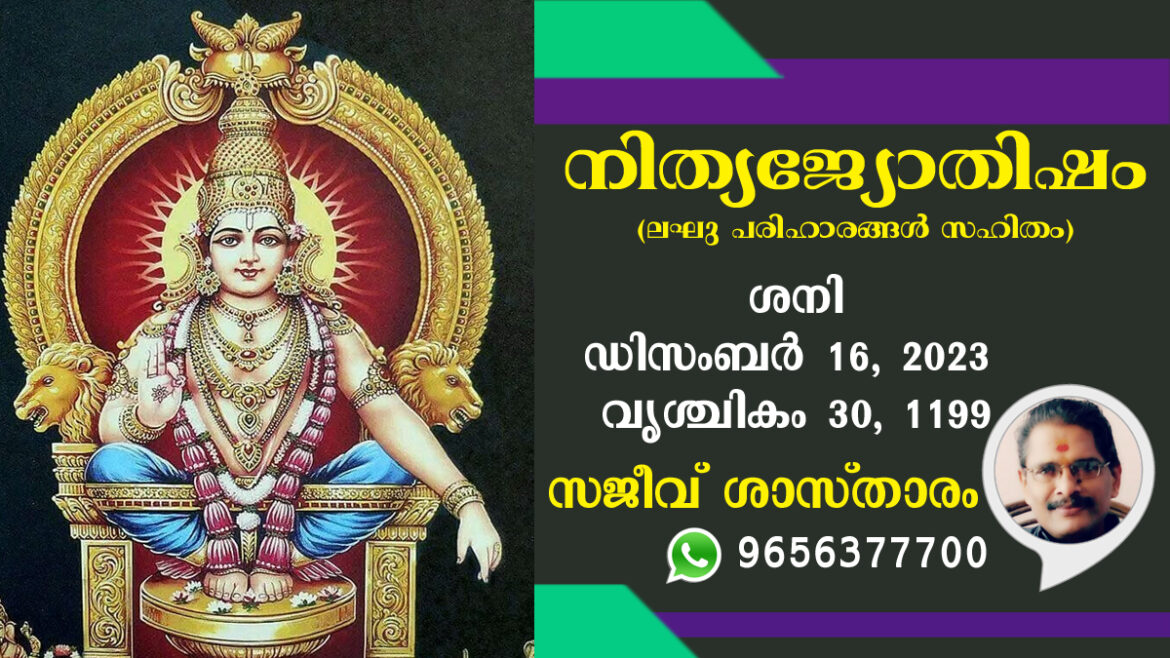 2023 ഡിസംബർ 16, ശനി കലിദിനം 1871829 കൊല്ലവർഷം 1199 വൃശ്ചികം 30