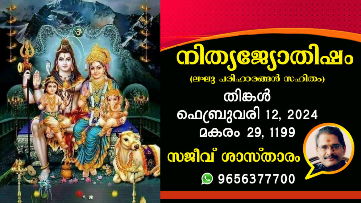 2024 ഫെബ്രുവരി 12, തിങ്കൾ കലിദിനം 1871887 കൊല്ലവർഷം 1199 മകരം 29