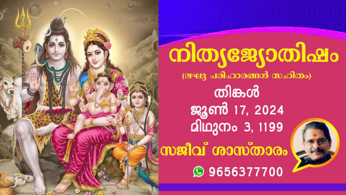 2024 ജൂൺ 17, തിങ്കൾ കലിദിനം 1872013 കൊല്ലവർഷം 1199 മിഥുനം 03 (൧൧൯൯ മിഥുനം ൦൩) തമിഴ് വര്ഷം ക്രോധി ആനി 03 ശകവർഷം 1946 ജ്യേഷ്ഠം 27