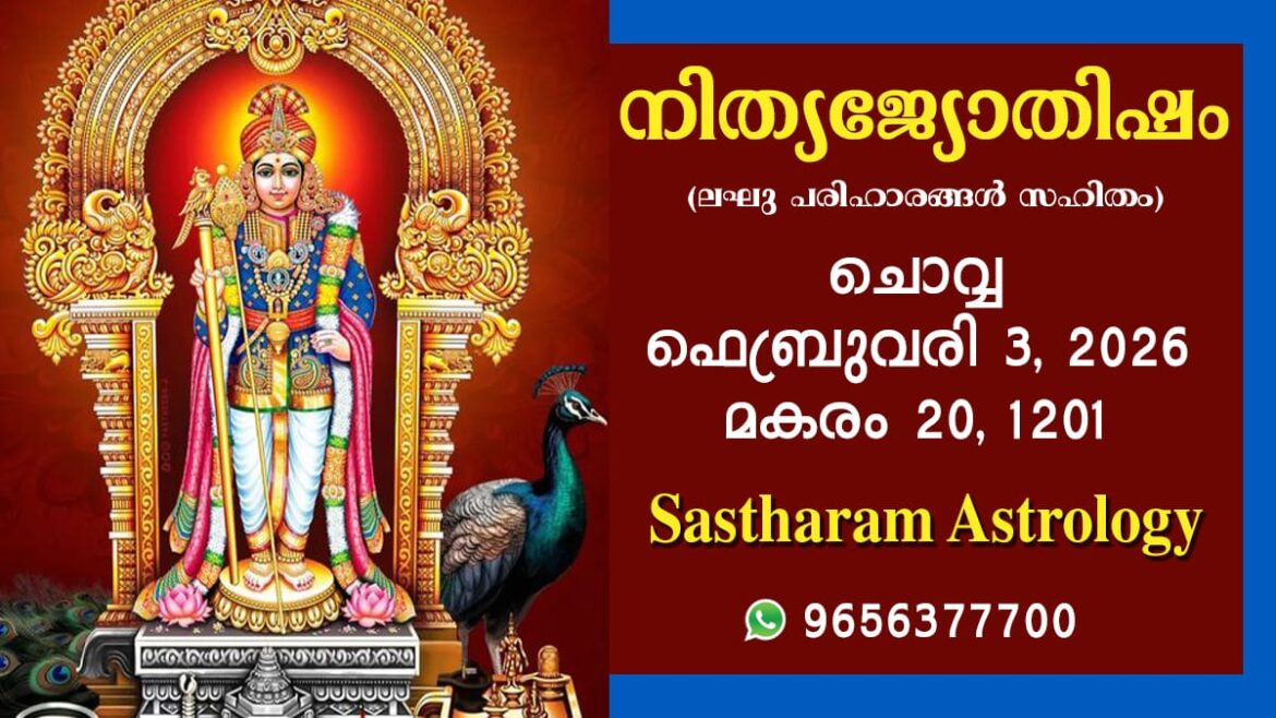 2026 ഫെബ്രുവരി 03, ചൊവ്വ കലിദിനം 1872609 കൊല്ലവർഷം 1201 മകരം 20