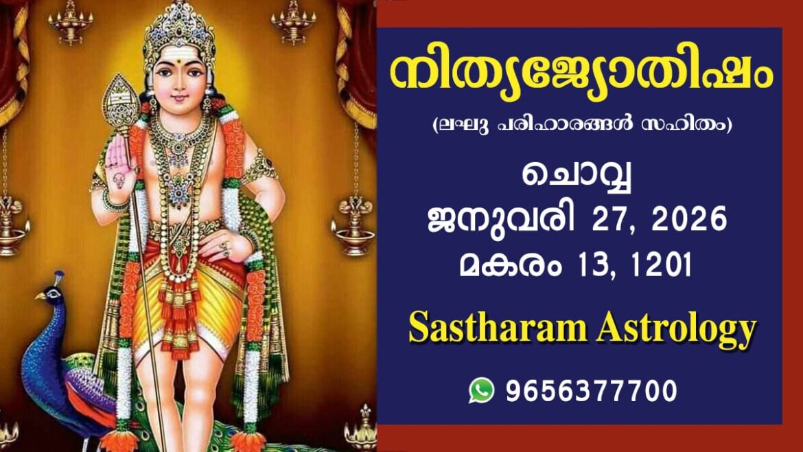 2026 ജനുവരി 27, ചൊവ്വ കലിദിനം 1872602 കൊല്ലവർഷം 1201 മകരം 13