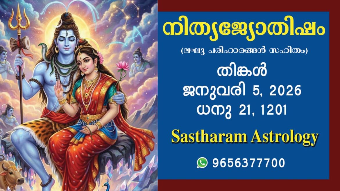 2026 ജനുവരി 05, തിങ്കൾ കലിദിനം 1872580 കൊല്ലവർഷം 1201 ധനു 21