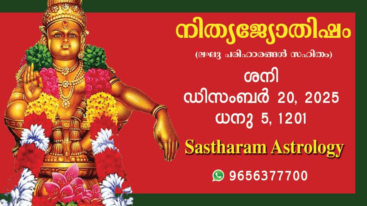 2025 ഡിസംബർ 20, ശനി കലിദിനം 1872564 കൊല്ലവർഷം 1201 ധനു 05