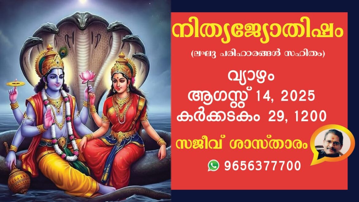( നേരം ഓൺ ലൈൻ ഫേസ്ബുക്കിൽ പതിവായി ലഭിക്കാൻ ആഗ്രഹിക്കുന്നവർ പോസ്റ്റുകൾ ലൈക്കും ഷെയറും ചെയ്യാൻ മറക്കരുത്. നേരം ഓൺലൈൻ ഇപ്പോള് വാട്സ്ആപ്പിലും ലഭ്യമാണ്. ഏറ്റവും പുതിയ വിശേഷങ്ങൾക്കായി ക്ലിക്ക് ചെയ്യൂ : riyoceline.com/projects/Neram/ . ) 2025 ആഗസ്റ്റ് 14, വ്യാഴംകലിദിനം 1872436കൊല്ലവർഷം 1200 കർക്കടകം 29(കൊല്ലവർഷം കർക്കടകം ൨൯ )തമിഴ് വർഷം വിശ്വവസു ആടി 30ശകവർഷം 1947 ശ്രാവണം 23 ഉദയം 06.15 അസ്തമയം 06.42 മിനിറ്റ്ദിനമാനം …