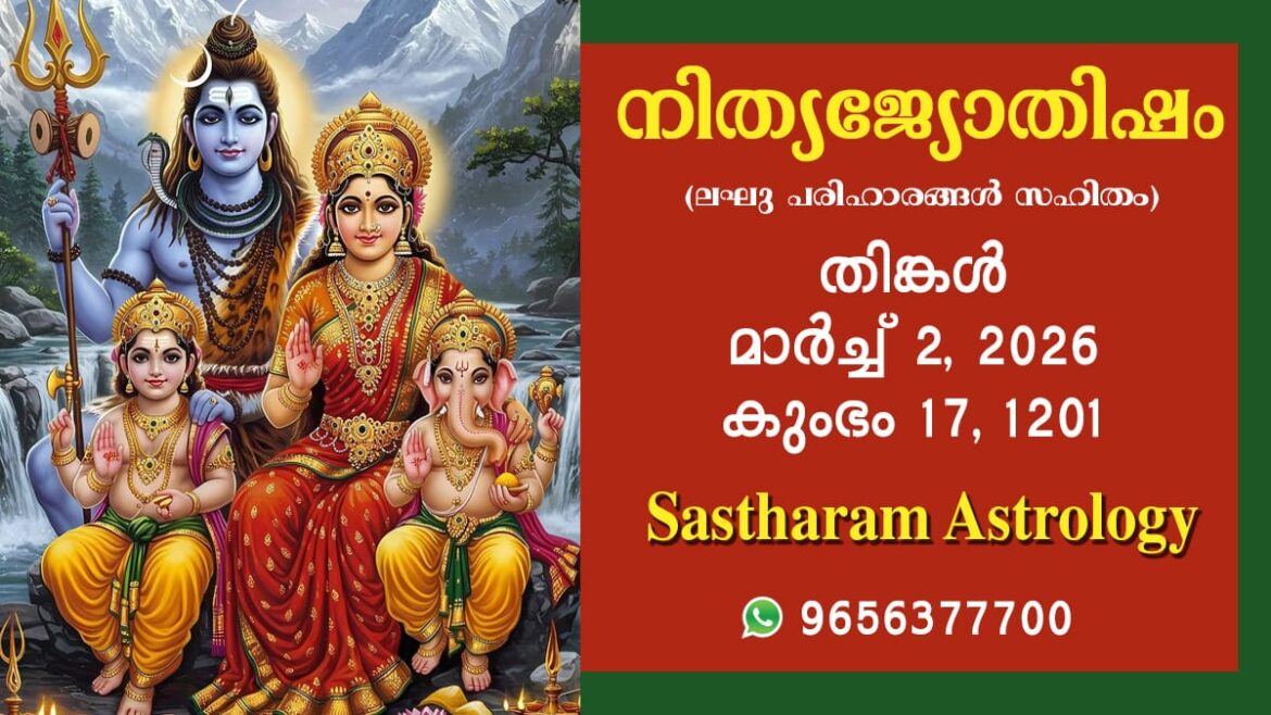 2026 മാർച്ച് 02, തിങ്കൾ കലിദിനം 1872637 കൊല്ലവർഷം 1201 കുംഭം 18