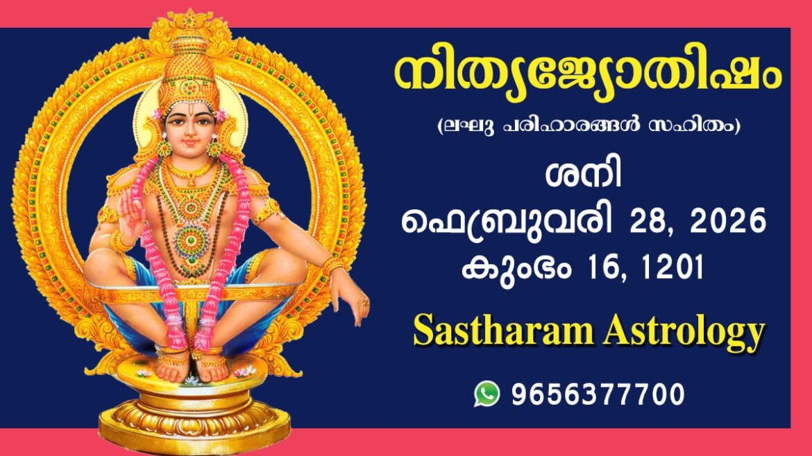 2026 ഫെബ്രുവരി 28, ശനി കലിദിനം 1872634 കൊല്ലവർഷം 1201 കുംഭം 16