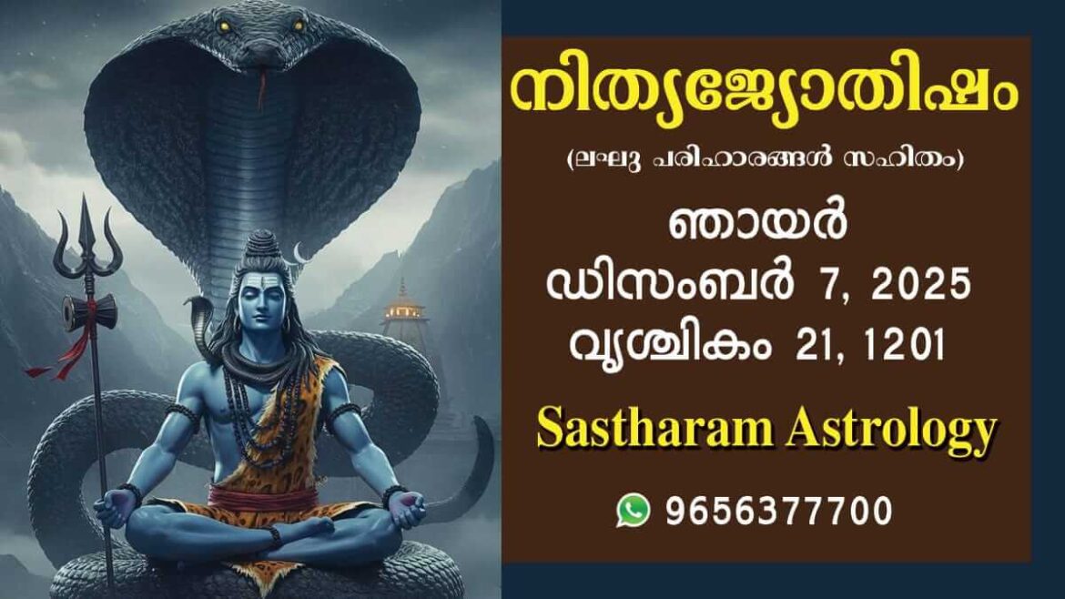 2025 ഡിസംബർ 07, ഞായർ കലിദിനം 1872551 കൊല്ലവർഷം 1201 വൃശ്ചികം 21