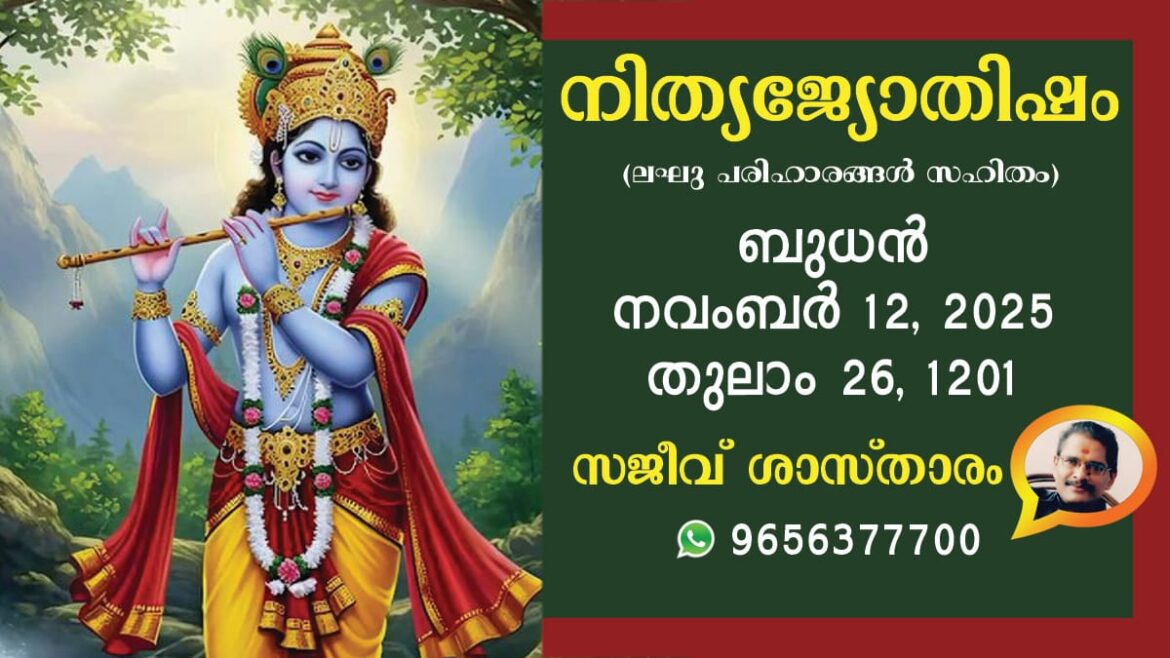 2025 നവംബർ 12, ബുധൻ കലിദിനം 1872526 കൊല്ലവർഷം 1201 തുലാം 26