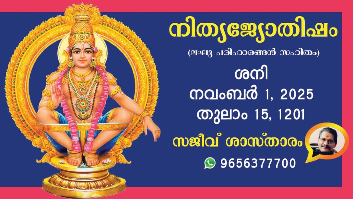 2025 നവംബർ 01, ശനി കലിദിനം 1872515 കൊല്ലവർഷം 1201 തുലാം 15 (കൊല്ലവർഷം 1201 തുലാം ൧൫ ) തമിഴ് വർഷം വിശ്വവസു അയ്പ്പശി 15 ശകവർഷം 1947 കാർത്തികം 10