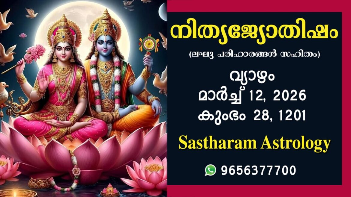 2026 മാർച്ച് 12, വ്യാഴം കലിദിനം 1872646 കൊല്ലവർഷം 1201 കുംഭം 28