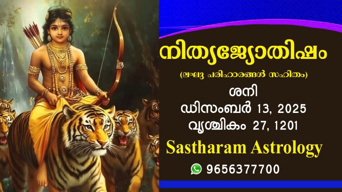 2025 ഡിസംബർ 13, ശനി കലിദിനം 1872557 കൊല്ലവർഷം 1201 വൃശ്ചികം 27